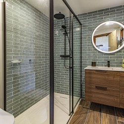 The fully-fitted, well-equipped kitchen, situated on the ground floor, is a modern culinary haven! It comes with an induction hob, an oven, a microwave, and a dishwasher. There’s also a coffee and tea station, a wine fridge, and a large American-style fridge/freezer for added convenience. A comfortable four-seater dining table allows you to enjoy your meals in style.
