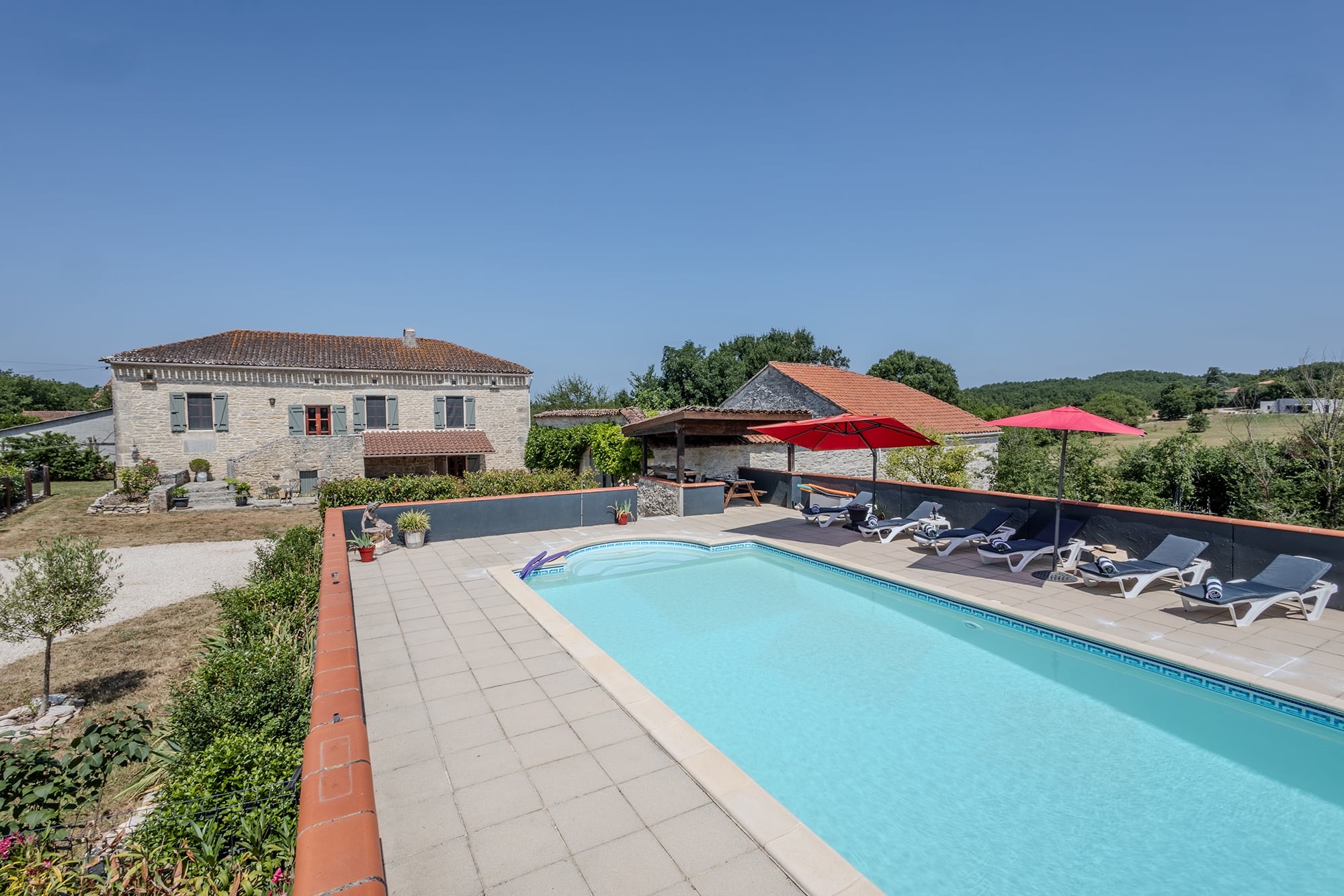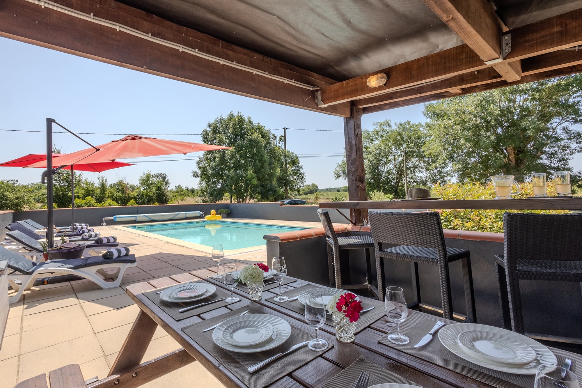 The pool area is shared with the Farmhouse and the Garden Gîte, as this entire holiday home in Floressas is exclusively yours. The highlight of the exterior, the large in-ground pool, surrounded by sunbeds and parasols. It’s a fantastic setting for relaxing in the sun. There’s also a shaded area by the pool where you can dine, lounge, read and relax on lazy afternoons.